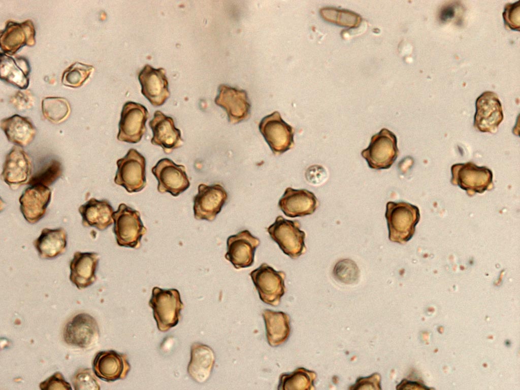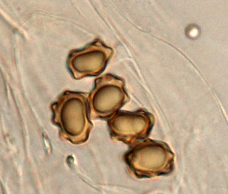 SPORES (8.0-) 8.5-9.8-10.5 (-11.5) ± 0.65 × 6.5-7.2-7.5 (-8.0) ± 0.46 mm, gibbous with mostly 8-12 small to moderate sized nodules, not prominently nodulose, yellowish brown (n=42/3). BASIDIA 31-32 × 10.5-11.5 mm, 4-sterigmate, sphaeropedunculate, hyaline. PLEUROCYSTIDIA 62-86 × 14-20 mm, fusiform or cylindric, occasionally more ventricose, rarely saccate, necks not delineated, merely tapered at both ends; apices obtuse and crystalliferous, below without a distinct pedicel; thick-walled, walls 2.0-3.0 (-5.0) mm thick, hyaline; moderately frequent. CHEILOCYSTIDIA similar to pleurocystidia but shorter and more variable in shape including cells lageniform in outline, at times not as thick-walled, mixed with numerous hyaline paracystidia. CAULOCYSTIDIA similar to cheilocystidia, mixed with cauloparacystidia and descending the entire length of the stipe. PILEIPELLIS a cutis of cylindric to inflated hyphae mostly 7-24 mm wide, these incrusted with pigments visible at 400X, yellowish brown to cinnamon brown in mass. CLAMPS present.